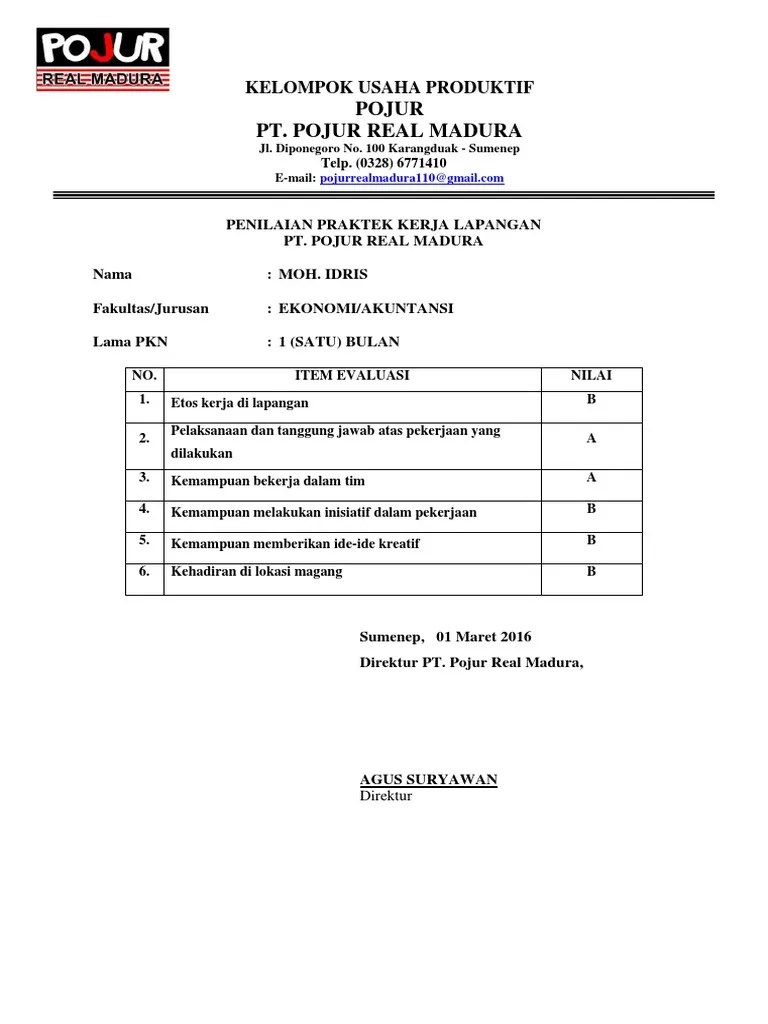 Praktikan melaksanakan pkl di pt rajafa group jakarta. Mahasiswa menyerahkan proposal pada instansi / perusahaan atau industri yang dituju. Rambu pelaksanaan pkl dan beberapa contoh lampiran yang terkait dengan. Gambar 3.1 logo pt pradewanta 27. Penilaian agenda dan absen magang1 doc form penilaian magang praktek kerja lapangan rita yuliandri academia edu contoh surat penilaian . Selain itu, jika mahasiswa tersebut memiliki penilaian kinerja yang baik dari perusahaan/instansi tempat pelaksanaan pkl, maka bukan hal yang. 4 komponen penilaian pkl oleh pembimbing eksternal…. Daftar nilai pkl dari dosen pembimbing perusahaan (fotocopy rangkap 2). Penilaian laporan praktek kerja lapangan (pkl) oleh dosen pembimbing laporan. Daftar yang memuat nomor, judul gambar, dan halaman dimana gambar itu berada. 4.8 contoh halaman daftar gambar. Lampiran f contoh halaman nilai pkl dari dosen pembimbing. Contoh daftar gambar dapat dilihat pada lampiran 6 halaman.