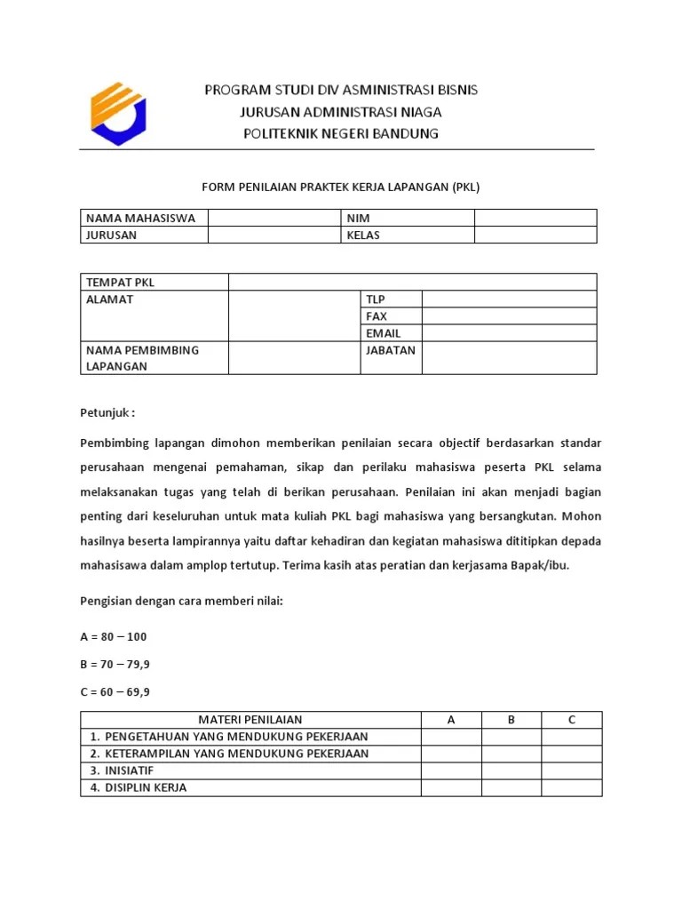 Penilaian hasil belajar peserta didik selama pelaksanaan program pkl dilakukan secara menyeluruh mencakup ranah sikap, pengetahuan, dan keterampilan. Daftar nilai pkl dari dosen pembimbing perusahaan (fotocopy rangkap 2). Selain itu, jika mahasiswa tersebut memiliki penilaian kinerja yang baik dari perusahaan/instansi tempat pelaksanaan pkl, maka bukan hal yang. 1.5.1 kriteria penilaian kerja lapangan oleh perusahaan/industri (60%). 4 komponen penilaian pkl oleh pembimbing eksternal….