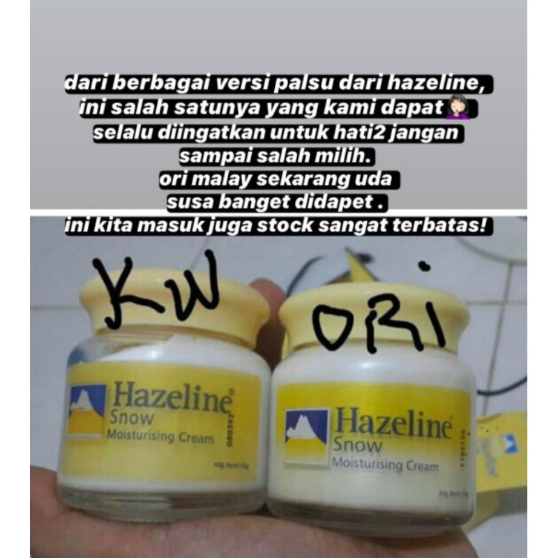 Cream hazeline snow ori dan moisturizing cream hazeline snow kw dengan harga murah. Baru rp 123.456 hazeline snow \ sudah tidak produksi lagi karena barang sudah tidak diproduksi dan tidak jual di indonesia akibat persaingan merk unilever . Snow malaysia asli dan palsu | cara bedain hazeline snow asli dan palsu . Promo grosir hazeline snow ori import malaysia free bubble. Info jual terlaris 100gr hazeline snow ± mulai rp 18.000 murah dari beragam.